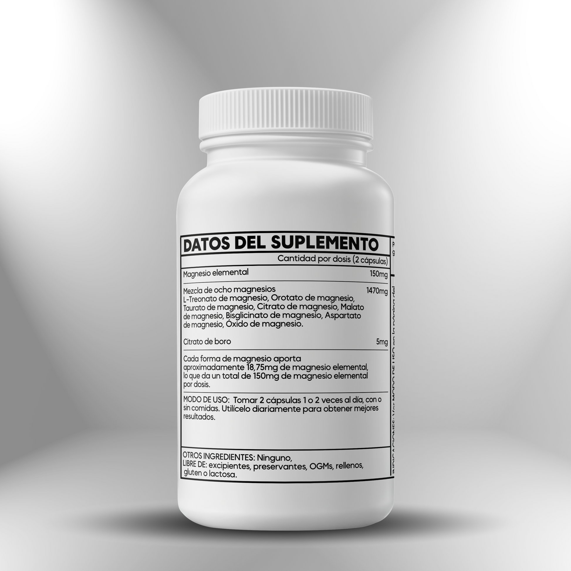 Esta fórmula ha sido diseñada con una selección meticulosa de diferentes tipos de magnesio en sus formas más biodisponibles. Utilizamos una combinación de magnesio L-Treonato, Orotato, Taurato, Malato, Aspartato, Bisglicinato, Citrato y Cloruro, cada uno elegido por su capacidad para ser absorbido de manera eficiente por el organismo. Esta sinergia entre las diferentes formas de magnesio asegura que se aproveche al máximo cada uno de sus beneficios, tanto para la función cerebral como muscular, además de favorecer la absorción y utilización del magnesio en el cuerpo de manera óptima.