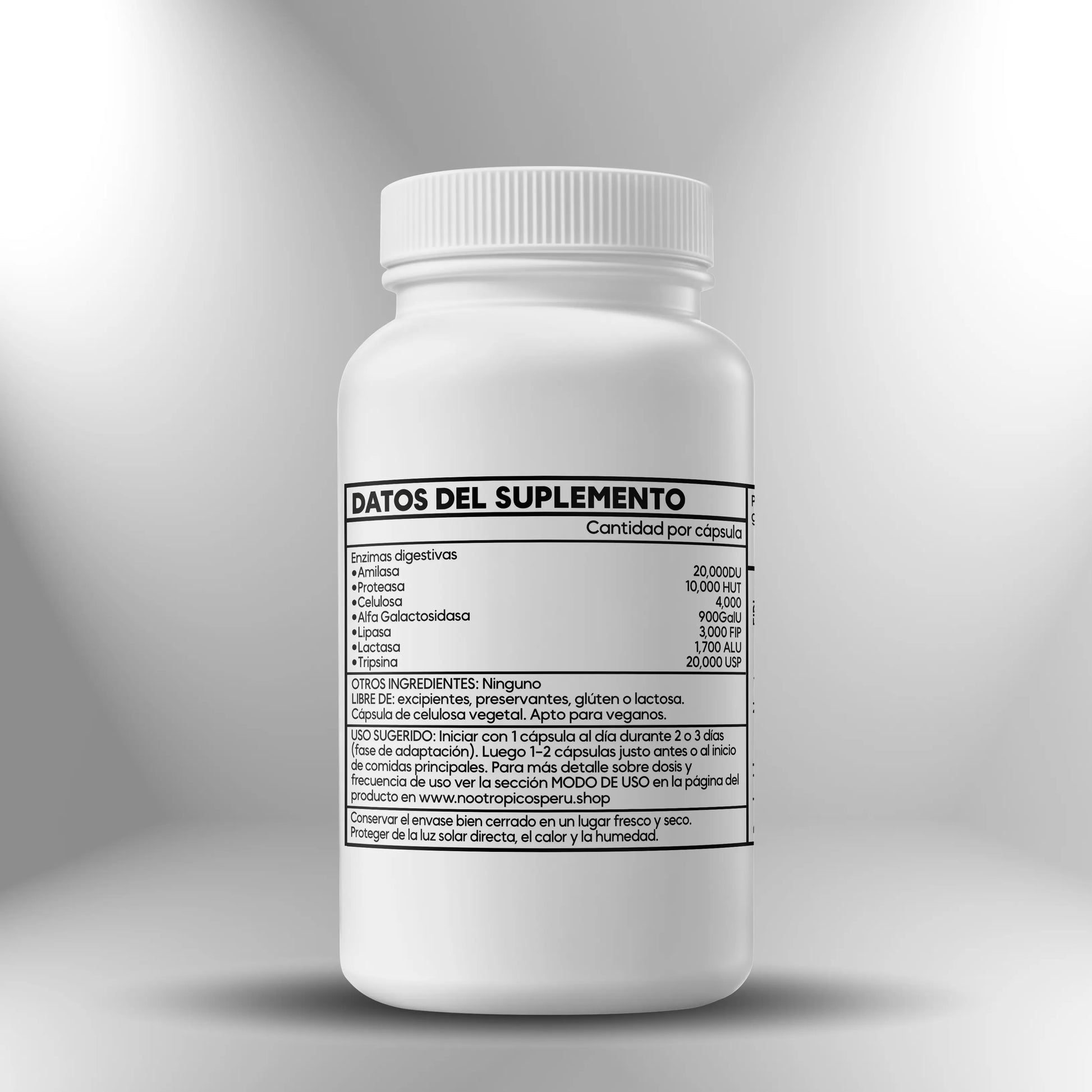 - No utilizar el producto después de la fecha de caducidad impresa en el envase, ya que aunque las enzimas caducadas no representan riesgo de toxicidad, su actividad catalítica reducida resulta en efectividad subóptima para apoyar la digestión de macronutrientes.