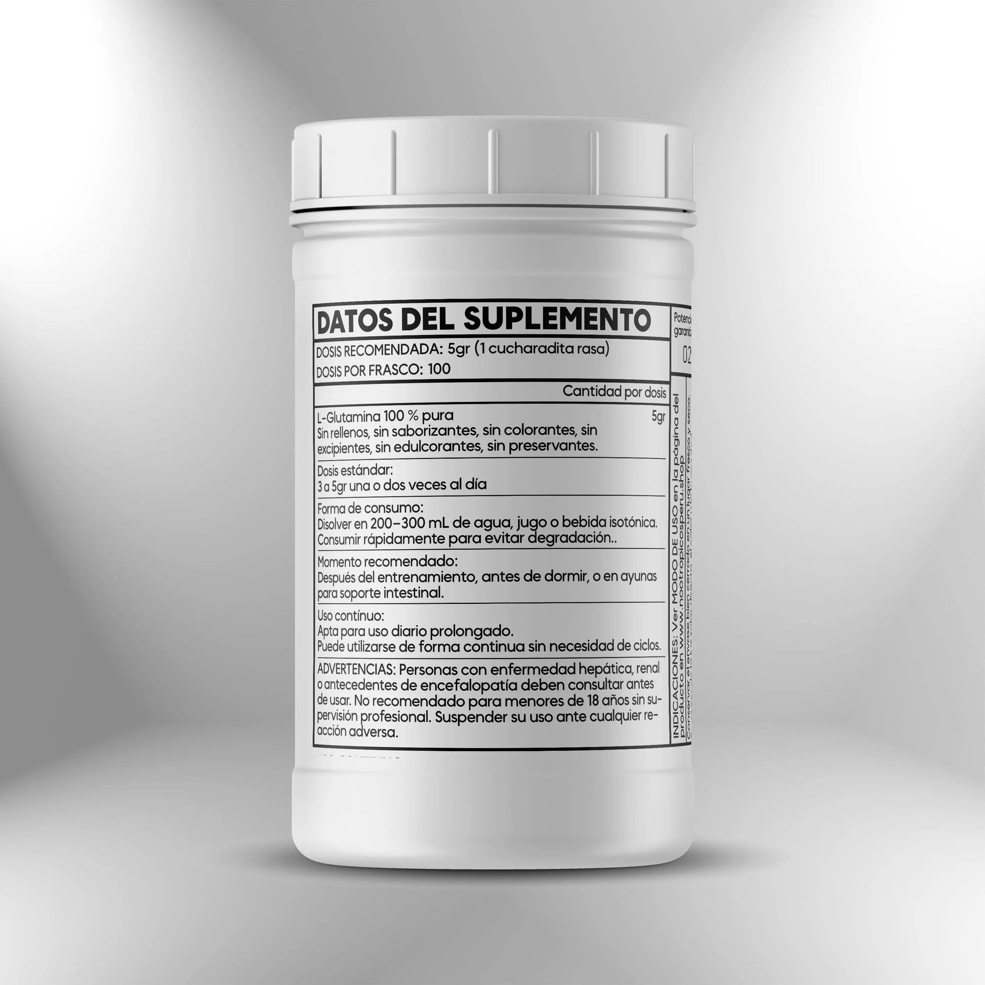 - La L-Glutamina es un aminoácido sensible a la temperatura; se recomienda encarecidamente no mezclar el polvo con líquidos calientes ni utilizarlo en preparaciones de cocción, ya que esto desnaturaliza el compuesto y reduce su efectividad biológica.